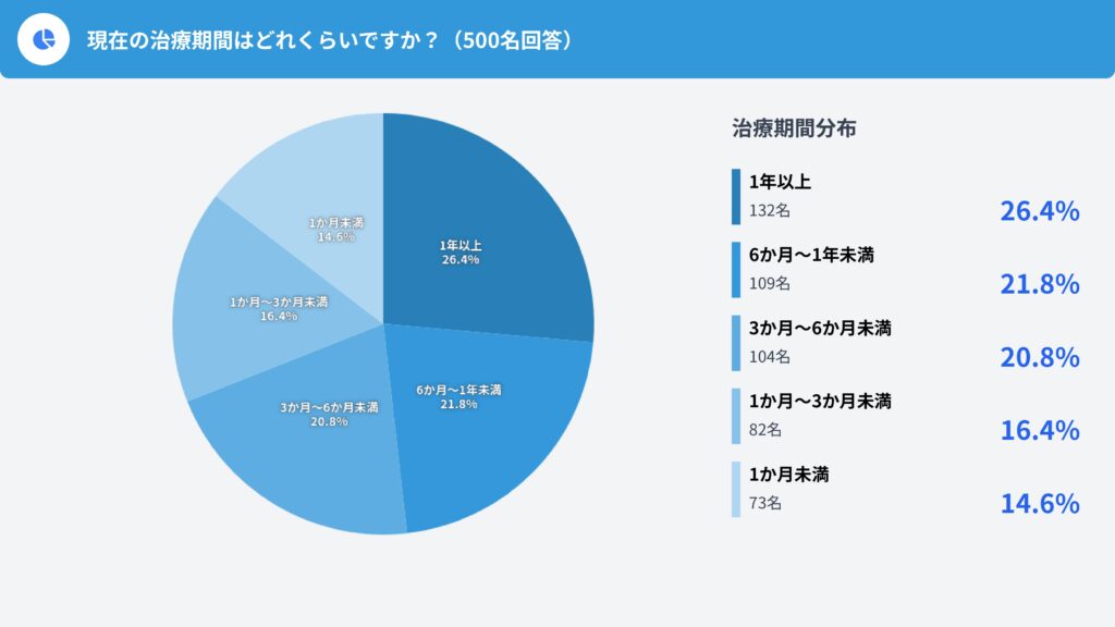 - 一方で、治療開始直後(1か月未満)の層は、まだ効果実感や継続意向が低い状態です。クリニックは、この初期段階での離脱を防ぐため、「3か月・6か月の継続目標」を設定し、期間に応じた効果の期待値を正確に伝えるコミュニケーションが重要です。