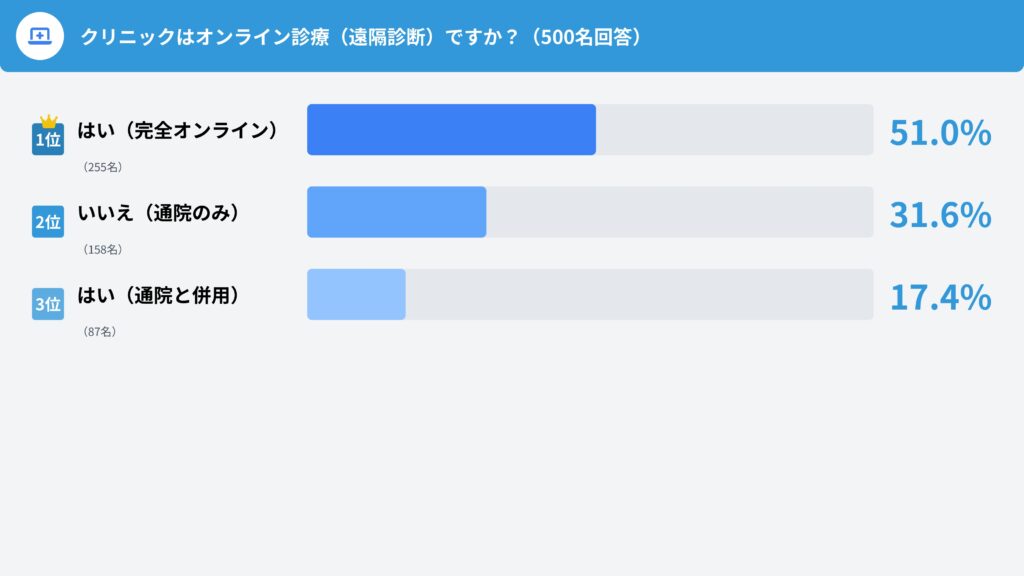 完全オンライン診療の利用率が51.0%と過半数を占め、AGA治療におけるデジタルトランスフォーメーション(DX)が完了したと言える状況です。オンライン化は、場所や時間の制約をなくすだけでなく、「クリニックに行く恥ずかしさ」という心理的障壁を解消し、治療人口の拡大に大きく貢献しています。