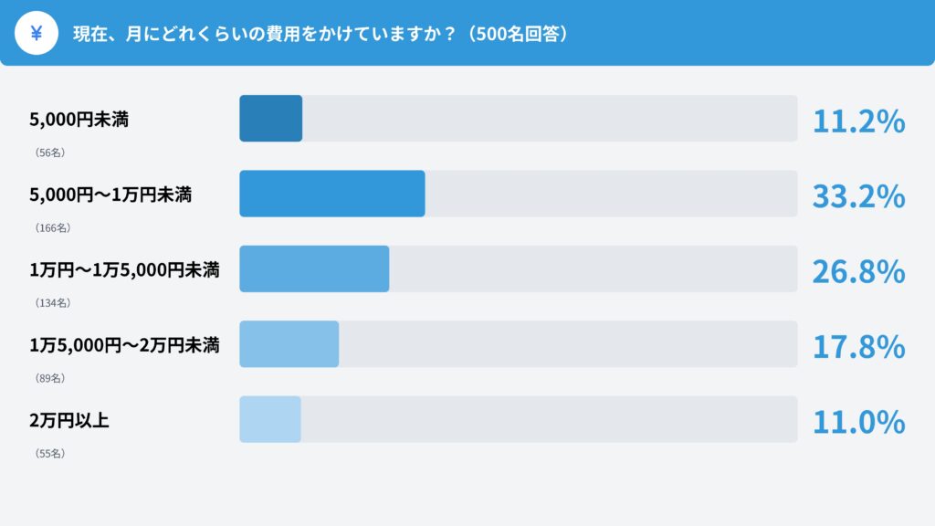 - 5,000円未満の低価格帯では、満足度(50.0%)と効果実感(57.2%)が他の層に比べて顕著に低く、費用を抑えることと効果実感には一定の相関があることが示されました。