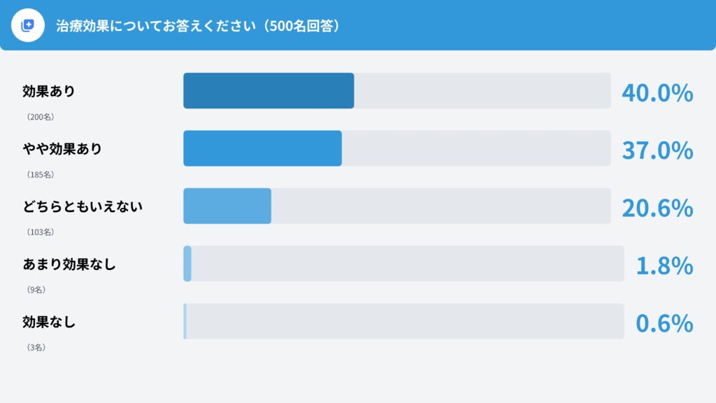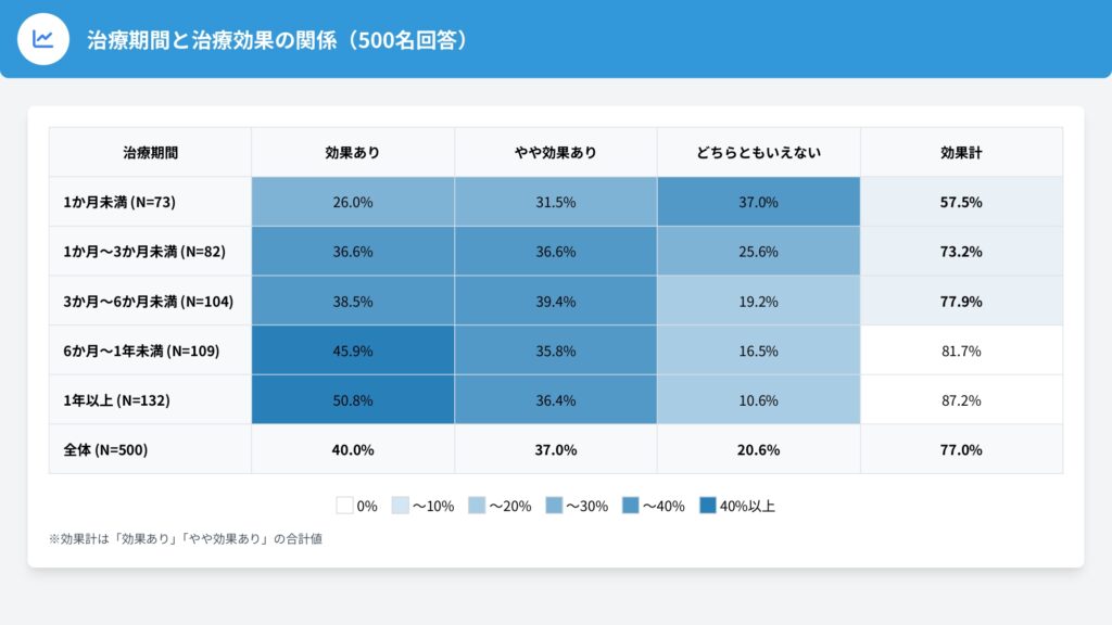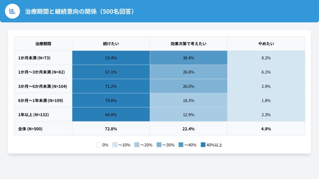 - 治療期間が長くなるにつれて、効果実感と継続意向が明確な相関をもって上昇しています。特に1年以上継続している層では、約9割が効果を実感し、8割以上が今後も治療を続けたいと考えています。