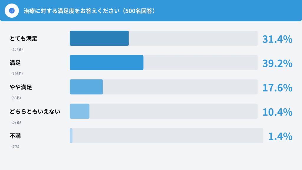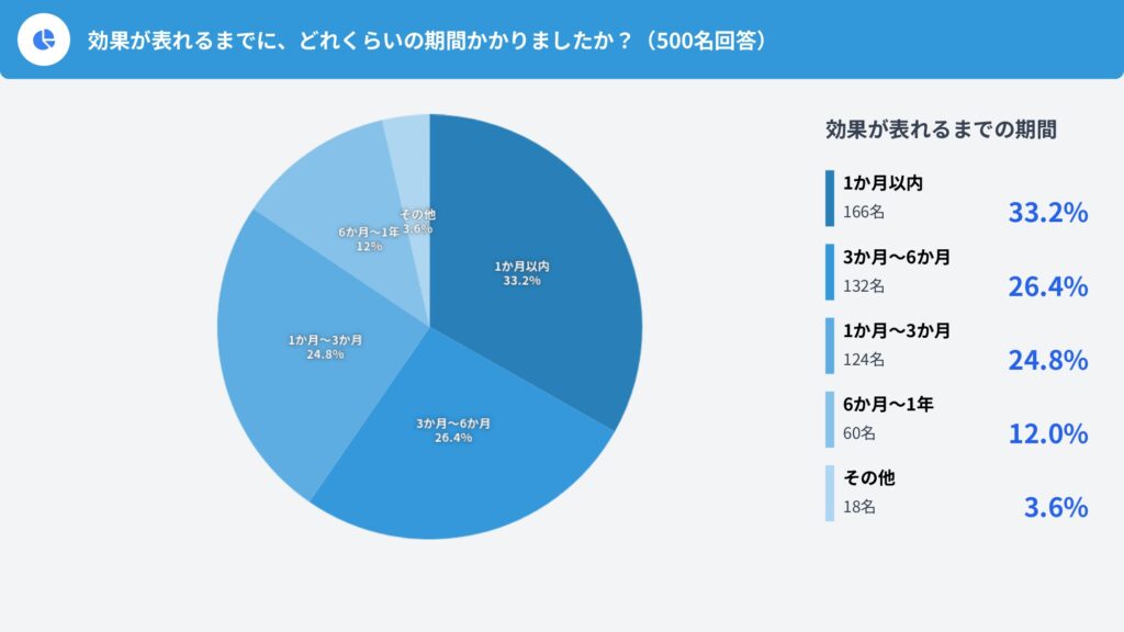 約3分の1が「1か月以内」に効果を実感していますが、「3か月〜6か月」を要した層が26.4%で2番目に多く、効果実感には個人差が大きいことがわかります。クリニックは、患者に対し「最低でも3〜6か月の継続が推奨される」という情報を初期段階で正確に伝えることが、途中の離脱を防ぐ上で重要です。