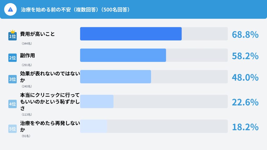 治療前の不安は、「費用」「副作用」「効果」という治療における3大リスクが上位を占めています。これらの不安を解消するため、費用プランの「明朗会計」、副作用に関する「正確で丁寧な説明」、そして治療効果に関する「科学的根拠と過去の実績の提示」が必須です。また、「恥ずかしさ」は22.6%と5人に1人が感じており、オンライン診療の推進がこの心理的障壁を取り除く有効な手段となります。