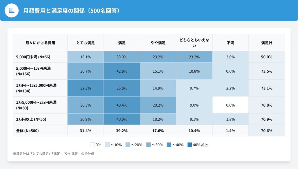 | 月々にかける費用 | 満足計(とても満足+満足) | 効果計(効果あり+やや効果あり) |