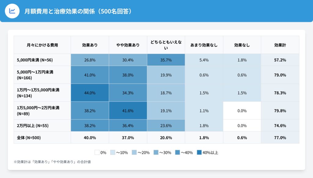 - 2万円以上かけている層は、費用が高いにもかかわらず、満足度や効果実感は1万円台の層と比較して突出して高くありません。これは、費用と満足度は単純な比例関係ではなく、患者が期待する「治療内容と価格の納得感」が重要であることを示唆しています。