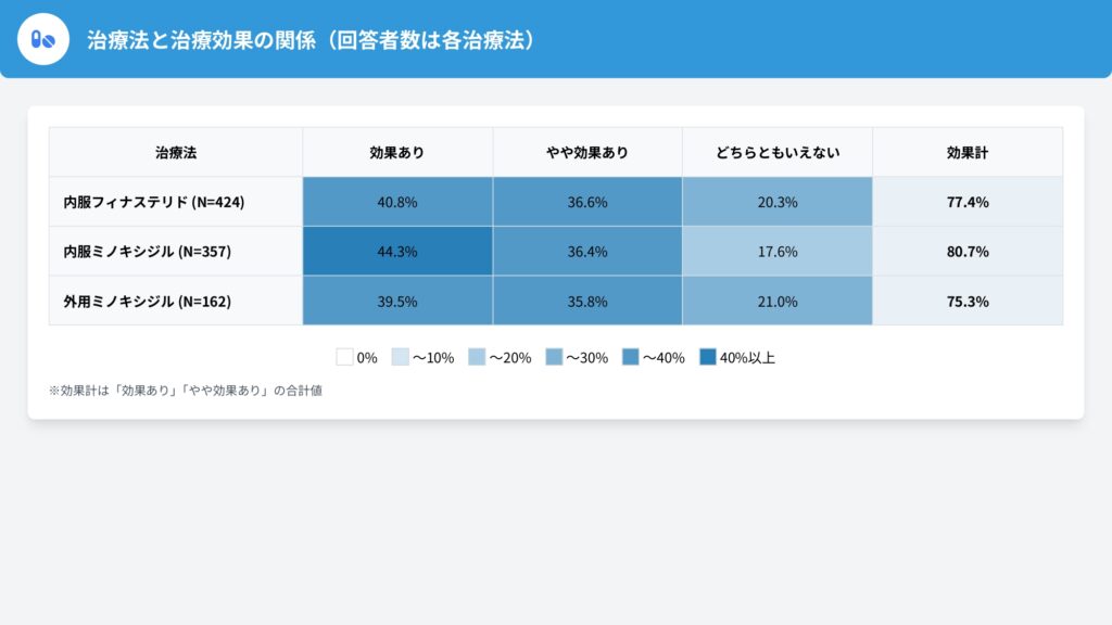 - この結果は、より積極的な発毛効果を期待できる複合的な治療法を選択している患者の方が、治療成果をより強く実感している傾向にあることを示しています。