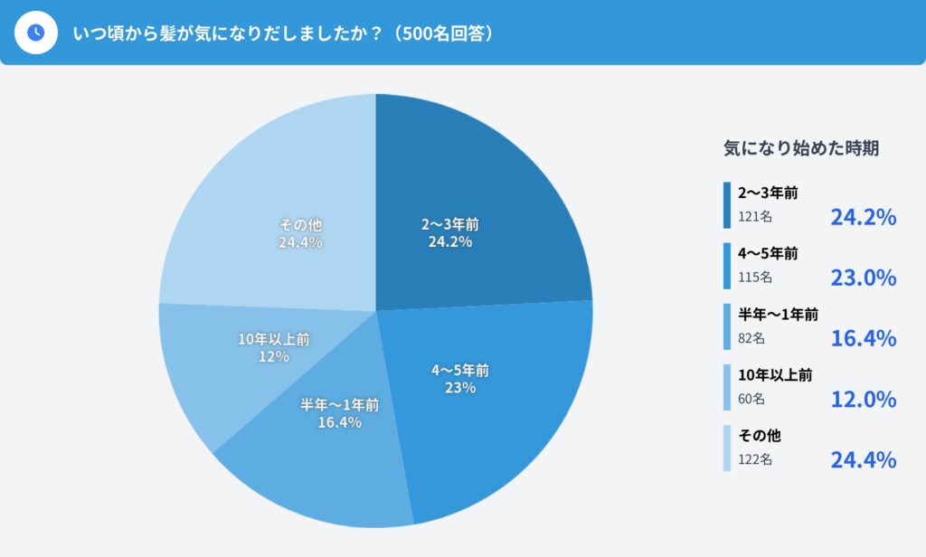 回答者の8割以上が20代後半から40代後半の男性であり、主にキャリアやライフイベントにおいて社会的な見た目が重視される世代が積極的に治療に取り組んでいることが明確です。特に20代後半〜30代前半の若年層が全体の約半分を占めることから、「早期治療」の意識が浸透していることが読み取れます。