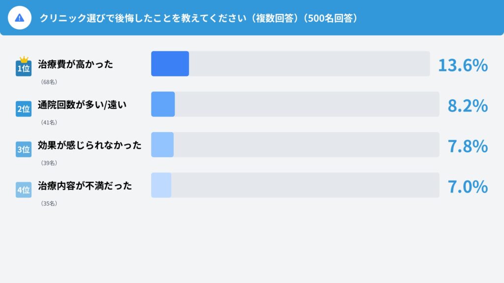 クリニック選定の決め手は、不安要素のトップであった「治療費の安さ」が最も高く、次いで「口コミ・評判」が僅差で続いています。これは、患者が「コストパフォーマンス」を最重視し、治療効果や満足度を他者の評価から判断していることを示しています。価格競争力とオンラインでの高評価獲得が、集客における最重要戦略となります。