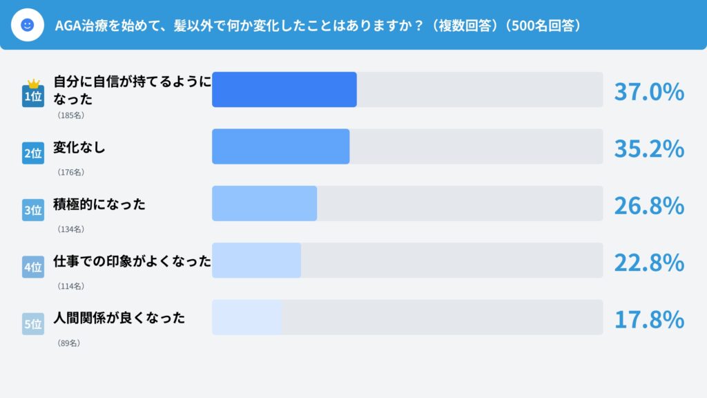 髪以外の変化として、「自分に自信が持てる」(37.0%)、「積極的になった」(26.8%)といった精神面でのポジティブな変化が上位を占めています。これは、Q4の「自信を持ちたい」という動機が達成されていることを示し、AGA治療が単なる容姿の改善ではなく、「心理的な治療」としての価値を提供していることを強く示唆しています。